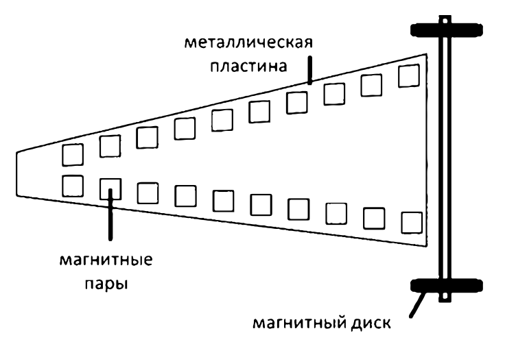 Закрепите магниты парами на металлической пластине, как показано на фото. Колёсная пара из двух магнитных дисков на общей оси при определённых условиях может ускоряться, проезжая над рядами магнитов. Исследуйте это явление.